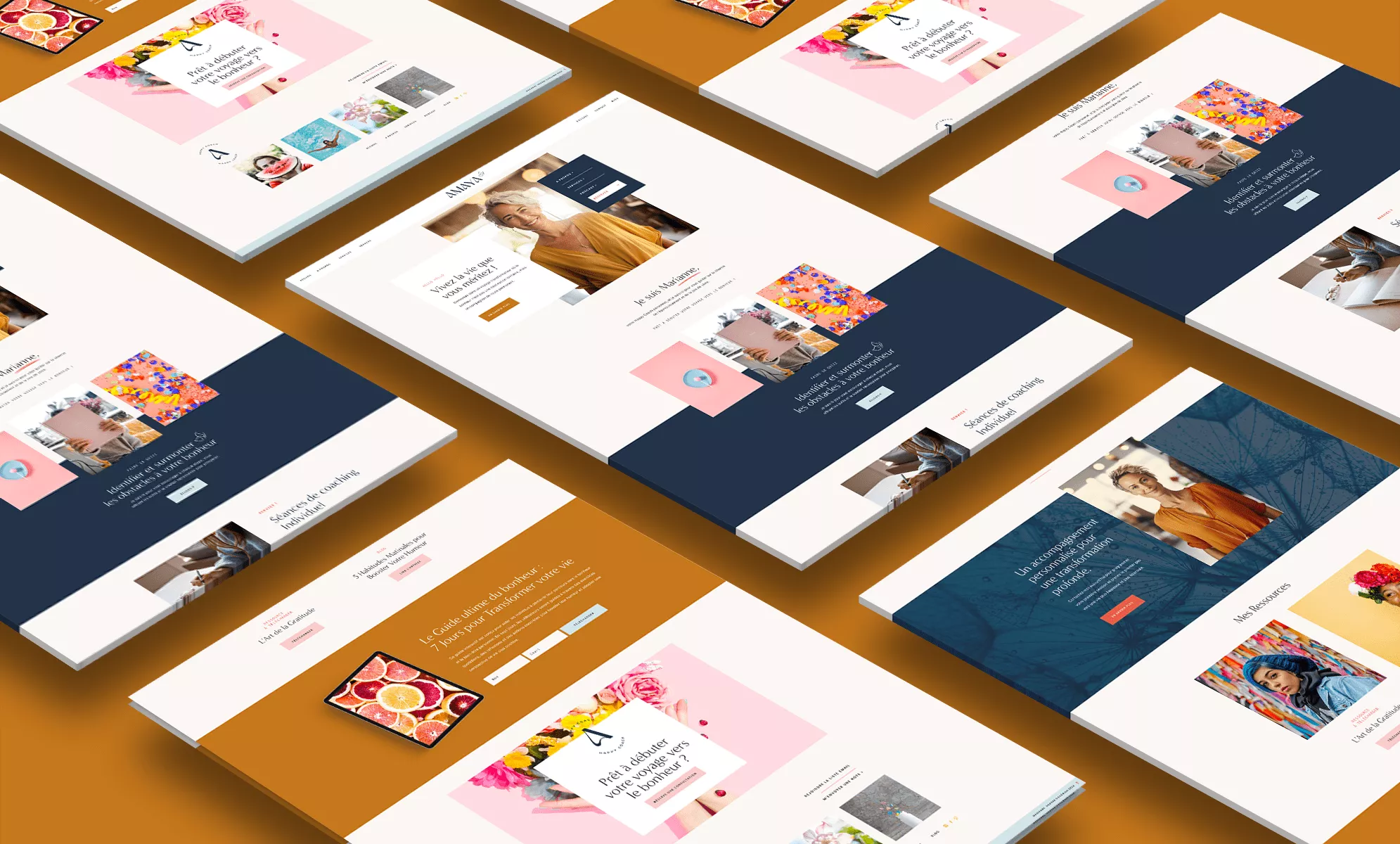L’identité visuelle et le site web revêtent une importance primordiale pour Amaya, car ils constituent le reflet visuel de sa philosophie et de son engagement envers ses clients. Une identité visuelle soigneusement conçue, accompagnée d’une palette de couleurs évocatrices et de visuels harmonieux, permet de transmettre visuellement les valeurs de positivité, d’alignement et d’épanouissement qui sont au cœur de sa pratique.
