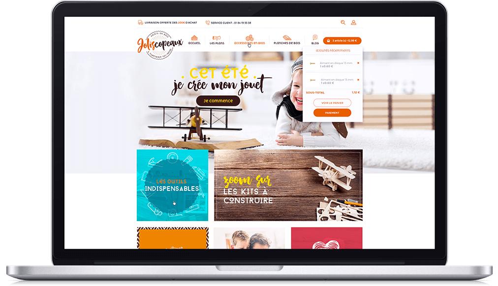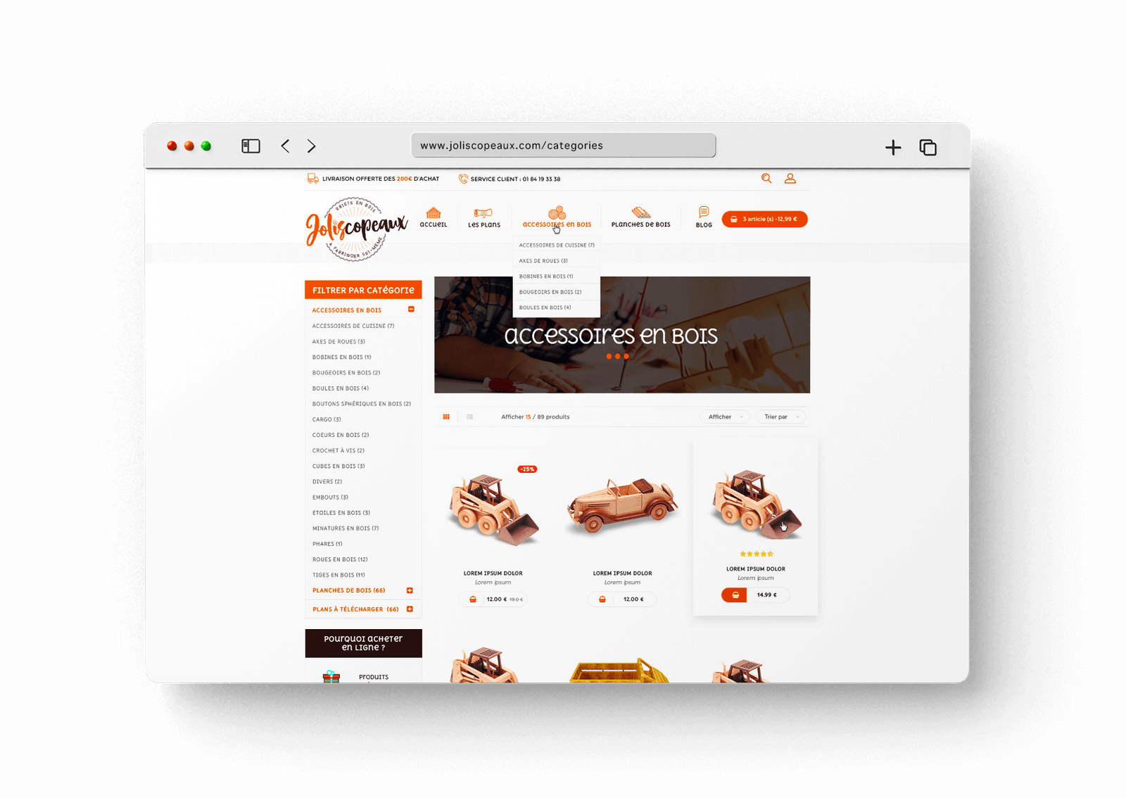 Joliscopeaux est un site de vente en ligne de loisirs créatifs en bois. Il offre des plans, des accessoires ainsi que des kits à construire pour la réalisation des modèles de jouets en bois. L’entreprise s’adresse à une marché de niche notamment ceux qui sont passionnés par le travail manuel et le bois.