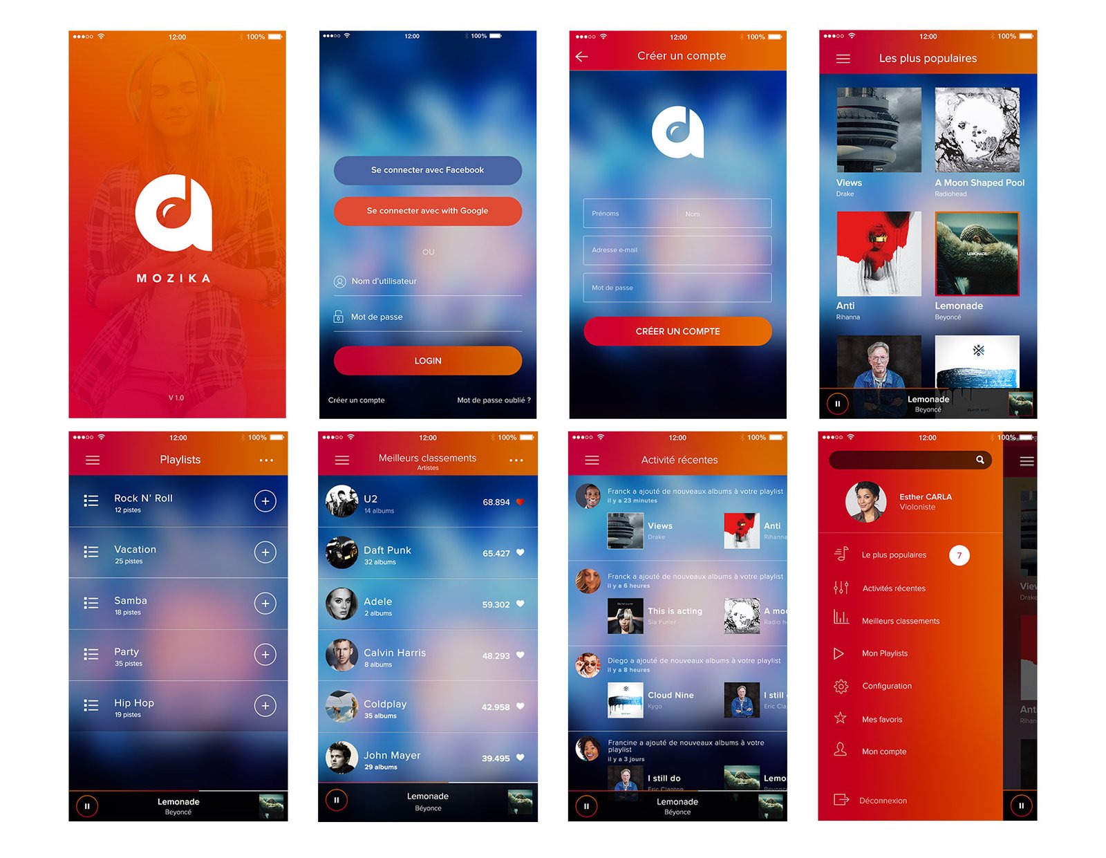 Mozika, une application mobile fictive permettant d’écouter de la musique, d’importer ses propres morceaux musicales, de créer des listes de lecture… J’ai conçu l’UX et l’UI de l’application pour la rendre plus intuitive, colorée et agréable à utiliser.